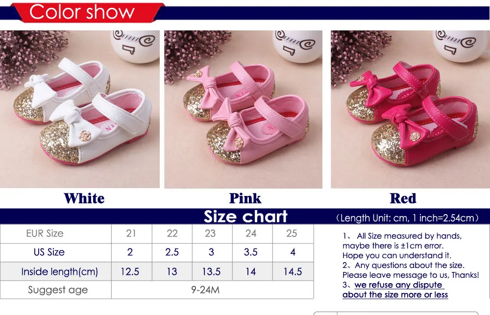 baby girl leather shoes Suitable for 9-24 months baby NOTES : 1: Please forget US or EUR Size, because all size are not standard,Just read the shoes inside length carefully, First measure baby foot length, Then choose right US Size.Suggest choose bigger than baby’s foot 5-10mm,
