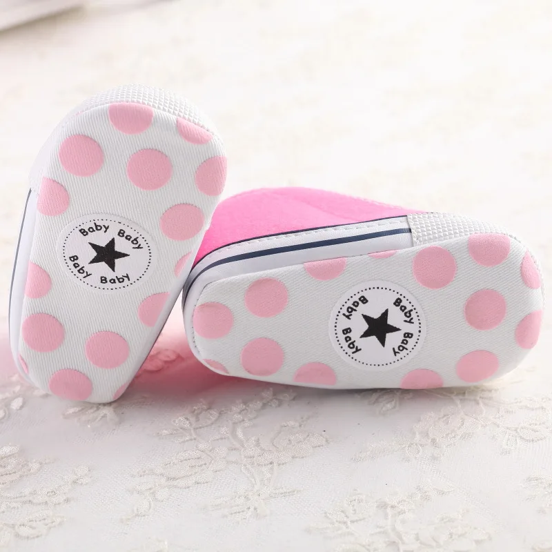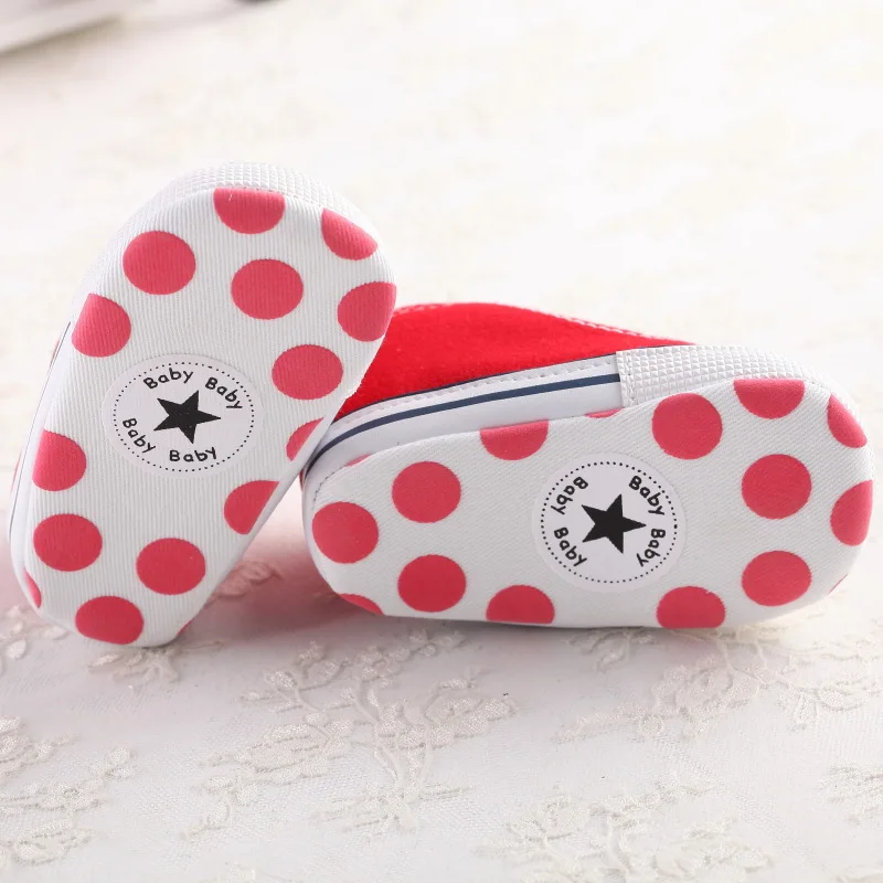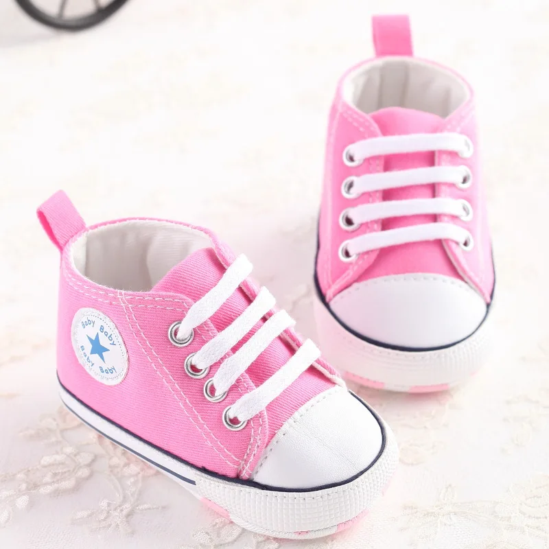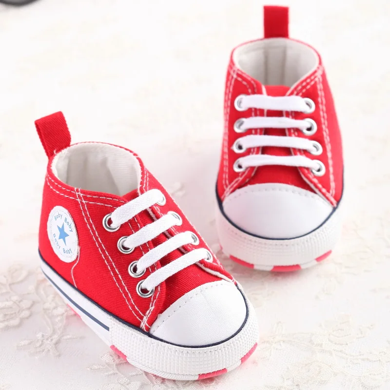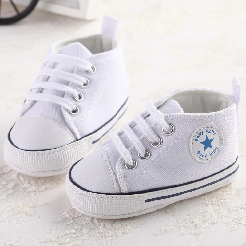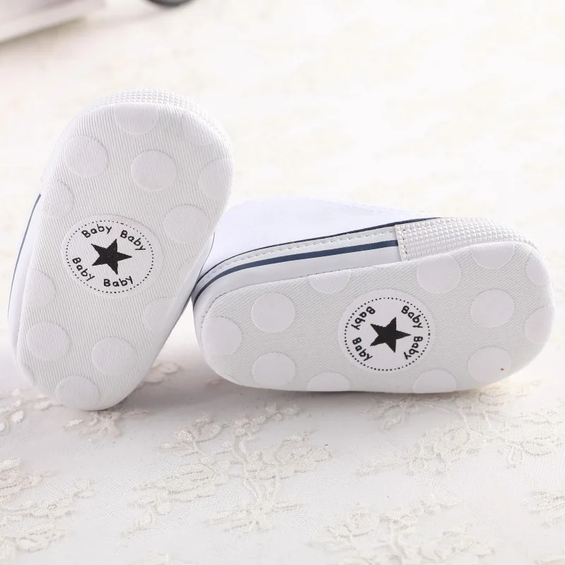 Material: Canvas Style: Baby First Walkers Color: Blue, Pink, Red, White Size: Fit for 0-18 months baby 1 inch= 2.54 cm please check the size reference: US 1.0= insole Length 11 CM/ 4.41” Suitable for 0-6 months baby US 2.0= insole Length 12 CM/ 4.92” Suitable for 6-12 months baby US 3.0= insole Length 13 CM/ 5.23” Suitable for 12-18 months baby We suggest that the shoes’ length should longer than your baby’s foot 0.5 to 1cm. Because of the different measurement methods, there may be 1-2cm of the allowable range error.