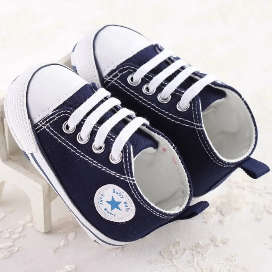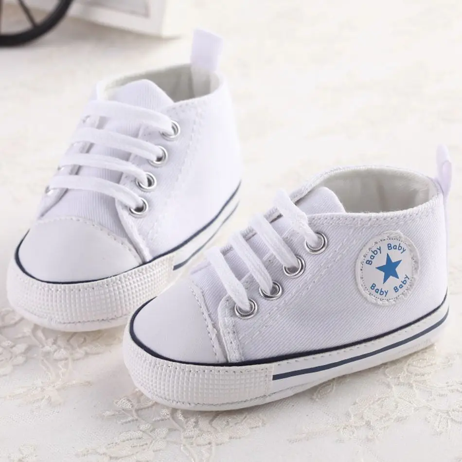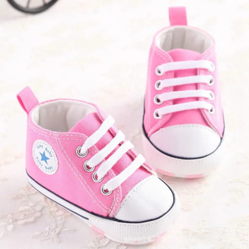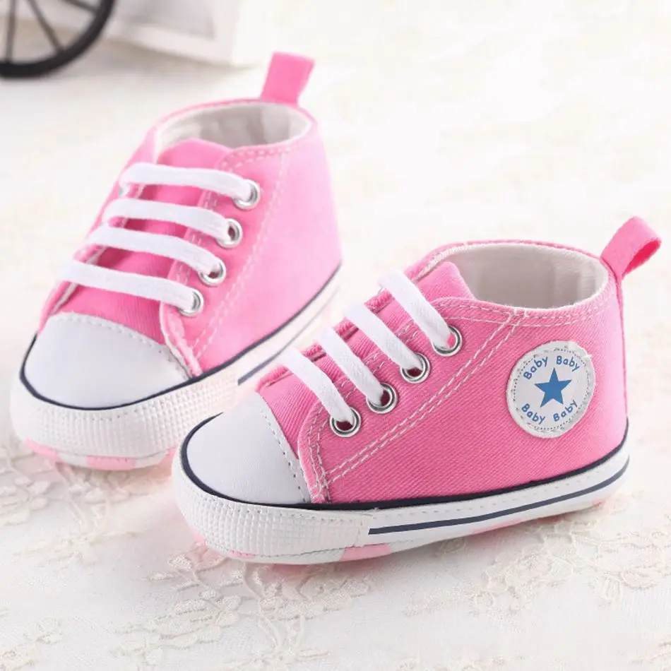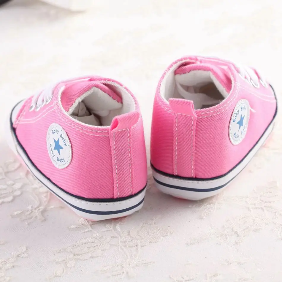 MUABABY Summer Baby Shoes Toddler Boys Girls First Walker Canvas Soft Sole Infant Shoes Kids Newborn Stars Lace Up Baby Sneakers