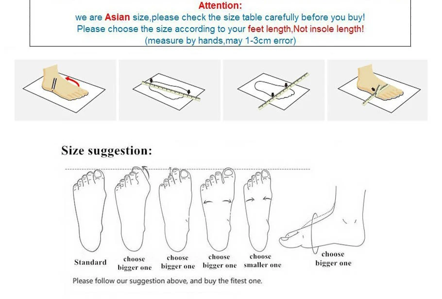 Please notice that the size above is inner length. And there maybe 0-1cm error due to the measure by hand. The size you need=length of your child\’s feet+1~2cm Please choose the bigger size for the children’s feet grow very fast, and we need some time to ship to you by China post air.