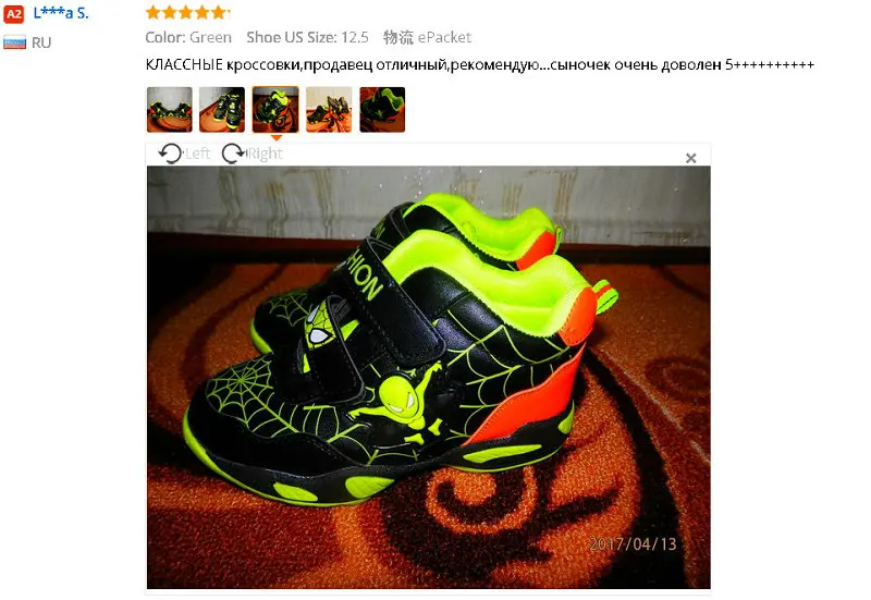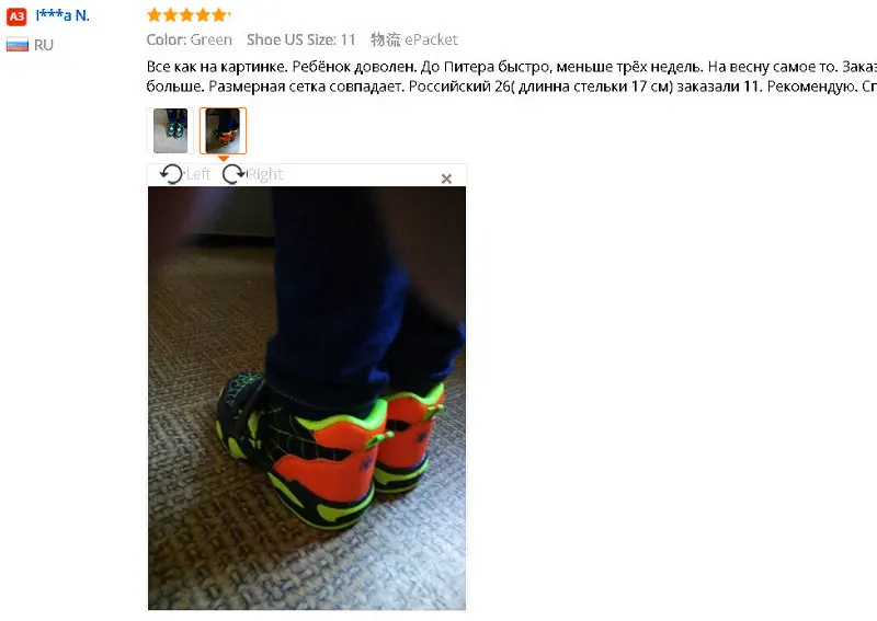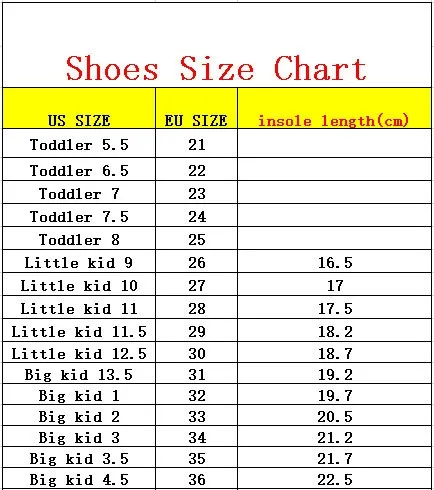 Feature: Color:Red,Blue,Green Size:26~36 Length:16.5~22.5 cm Dear friends: Because all children shoes size is difference,When you order the children’s shoes,you should according to Our size and internal length. According to the Insole length.(Insole length=Foot length +1cm) The US size is Not Standard ,Just convenient for you to do order. The comfortable length is the foot length add about 1cm. And Because of the long time delivery time by China Post Air Mail and child will grow up fast please choose more bigger size shoes for your child. Please choose the right size. All shoes will be shipped with bubble bags,no boxes !!!