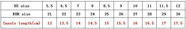 Please notice that the size above is inner length. And there maybe 0-1cm error due to the measure by hand. The size you need=length of your child’s feet+1~2cm Please choose the bigger size for the children’s feet grow very fast, and we need some time to ship to you by China post air.