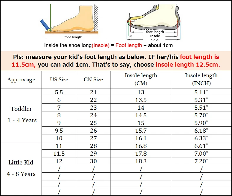 Pls measure your kid’s foot length as below. If her/his foot length is 11.5cm,