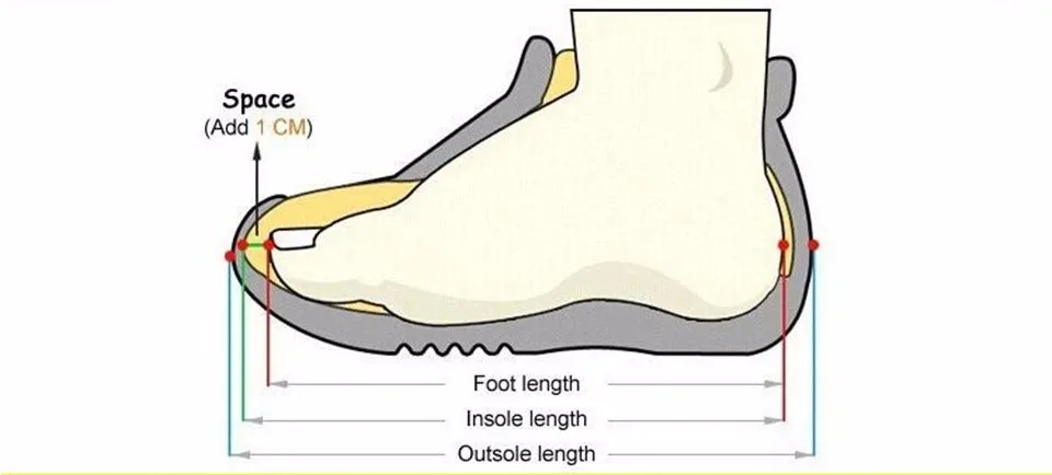 Inner length=foot length+1cm(for casual shoes and sandals) or 1.5cm for boots