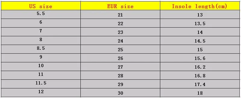 US Size EUR Size Inner Length (cm) 5.5 21 13.5 cm 6 22 14 cm 7 23 14.5 cm 8 24 15 cm 8.5 25 15.5 cm 9.5 26 15.8 cm 10 27 16.2 cm 11 28 16.8 cm 11.5 … Read More