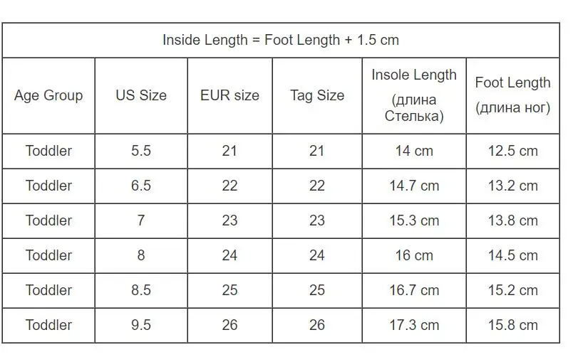 If your kids foot length is 15cm,then add 1cm,you need choose the size which insole length is 16cm.