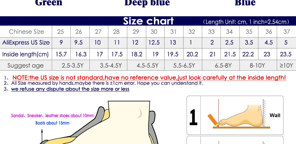 Summer baby children boy Genuine Leather Sandal shoes NOTES : 1: Please forget US or EUR Size, because all size are not standard,Just read the shoes inside length carefully, First measure kid foot length, Then choose right US Size.Suggest choose bigger than kid’s foot 10mm,