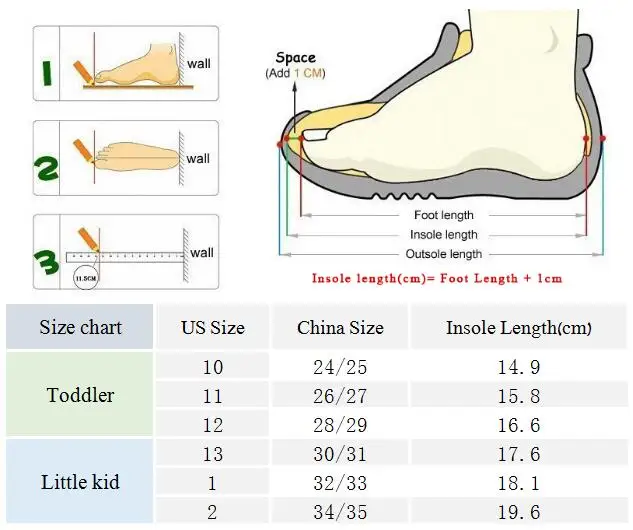 The US size is not the shoes of the standard size. US size only For buyers to purchase use . The buyers buy the right shoes according length of child’s feet, The size you need=length of your child’s feet+1cm For example: Your child foot length is 18cm, and then you need to order the insole size 19cm. Please choose the bigger size for children,children’s feet grow very fast, and you need some time to receive the shoes The shoes comes without box