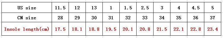 Please notice that the size above is inner length. And there maybe 0-1cm error due to the measure by hand. The size you need=length of your child’s feet+1~2cm Please choose the bigger size for the children’s feet grow very fast, and we need some time to ship to you by China post air.
