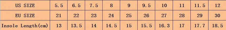 US size only For buyers to purchase use . The buyers buy the right shoes according length of child’s feet, The size you need=length of your child’s feet+0.8~1.5cm Please choose the bigger size for children,the children’s feet grow very fast, and you need some time to receive the shoes