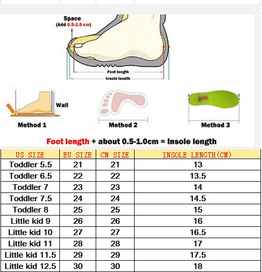 Notes: 1.Please strictly follow the size chart to select the size. Don’t select directly according to your habits. Please allow insole length 0.5 cm error due to manual measurement . 2.Insole length = kid’s foot length + 0.5 cm. You also can +1 cm if baby feet are fat. You’d better measure baby foot length by ruler. 3.The size number marked in the shoes’ sole is China size, not EU size !!! The length number which you see marked in the shoes outsole is useless, not insole length which we write in the size chart !!!! 4. Most shoes will be perfectly delivered to your hand 🙂 .We have tried our best to reject some shoes of visiable gule.But A little little Gule mark of partial shoes is happened inevitably during the factory production. If you cannot even accept any little little gule,we’re sorry that you may can try other stores. 5. If ordered the wrong sizes by yourself or just not like the shoes, you can return the shoes to us. We can refund you the money except the shipping charge from China to your destination (which we have paid the China post or other express) . 6. All shoes will be shipped with bubble bags,no boxes !!!