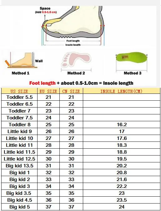 Notes: 1.Please strictly follow the size chart to select the size. Don’t select directly according to your habits. Please allow insole length 0.5 cm error due to manual measurement . 2.Insole length = kid’s foot length + 0.5 cm. You also can +1 cm if baby feet are fat. You’d better measure baby foot length by ruler. 3.The size number marked in the shoes’ sole is China size, not EU size !!! The length number which you see marked in the shoes outsole is useless, not insole length which we write in the size chart !!!! 4. Most shoes will be perfectly delivered to your hand 🙂 .We have tried our best to reject some shoes of visiable gule.But A little little Gule mark of partial shoes is happened inevitably during the factory production. If you cannot even accept any little little gule,we’re sorry that you may can try other stores. 5. If ordered the wrong sizes by yourself or just not like the shoes, you can return the shoes to us. We can refund you the money except the shipping charge from China to your destination (which we have paid the China post or other express) . 6. All shoes will be shipped with bubble bags,no boxes !!!