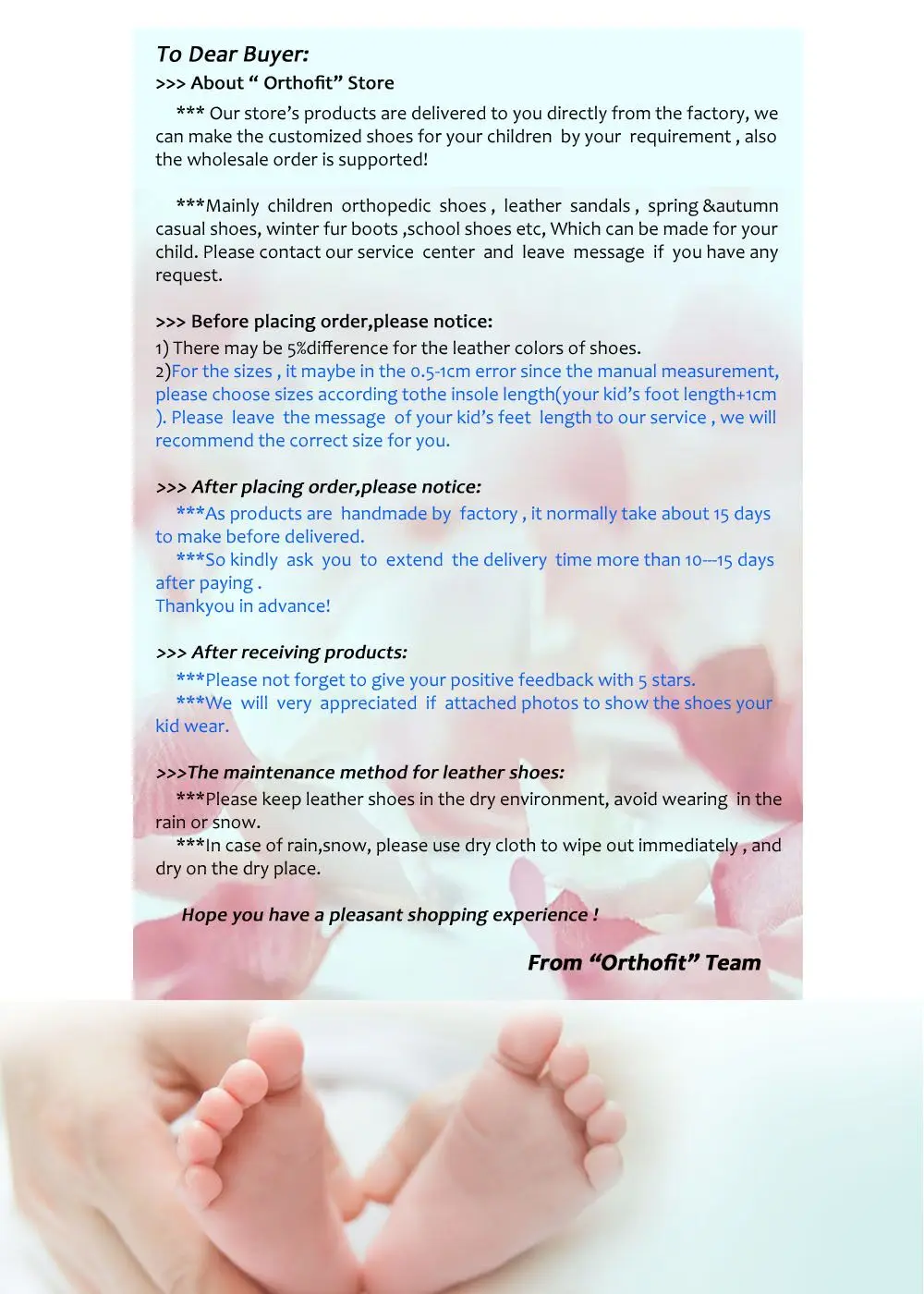 1)Below size chart is for insole length,not feet length.Please measure your child’s feet and add 1 cm to choose the size.It is better to leave message or tell us your child’s feet length,the best recommend will be provided to you.