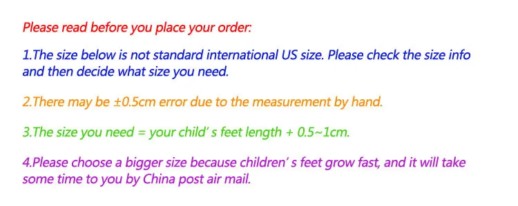 SIZE CHART: US SIZE 10 = EUROPEAN SIZE 28 = INSIDE 18CM US SIZE 11 = EUR SIZE 29 = INSIDE 18.6CM US SIZE 11.5 = EUR SIZE 30 = INSIDE 19.3CM US SIZE 12.5 = EUR SIZE 31 = INSIDE 20CM US SIZE 13 = EUR SIZE 32 = INSIDE 20.7CM US SIZE 1 = EUR SIZE 33 = INSIDE 21.3CM US SIZE 1.5 = EUR SIZE 34 = INSIDE 22CM US SIZE 2.5 = EUR SIZE 35 = INSIDE 22.7CM US SIZE 3 = EUR SIZE 36 = INSIDE 23.4CM US SIZE 3.5 = EUR SIZE 37 = INSIDE 24CM US SIZE 4 = EUR SIZE 38 = INSIDE 24.7CM US SIZE 4.5 = EUR SIZE 39 = INSIDE 25.4CM PLEASE CHOOSE THE SIZE ACCORDING TO THE INSIDE LENGTH.