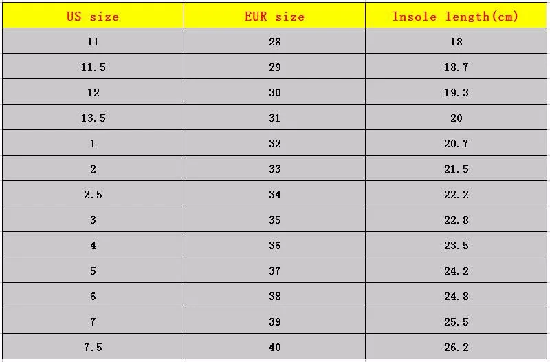 Please notice that the size above is inner length. And there maybe 0-1cm error due to the measure by hand. The size you need=length of your child’s feet+1~2cm Please choose the bigger size for the children’s feet grow very fast.
