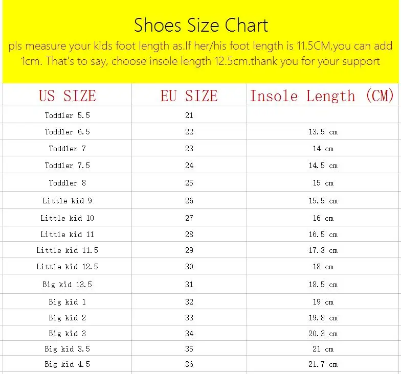 Because all children shoes size is difference,When you order the children’s shoes,you should according to Our size and internal length.