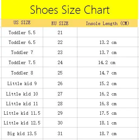 Because all children shoes size is difference,When you order the children’s shoes,you should according to Our size and internal length.