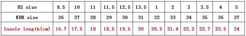 Please notice that the size above is inner length. And there maybe 0-1cm error due to the measure by hand. The size you need=length of your child’s feet+1~2cm Please choose the bigger size for the children’s feet grow very fast, and we need some time to ship to you by China post air.