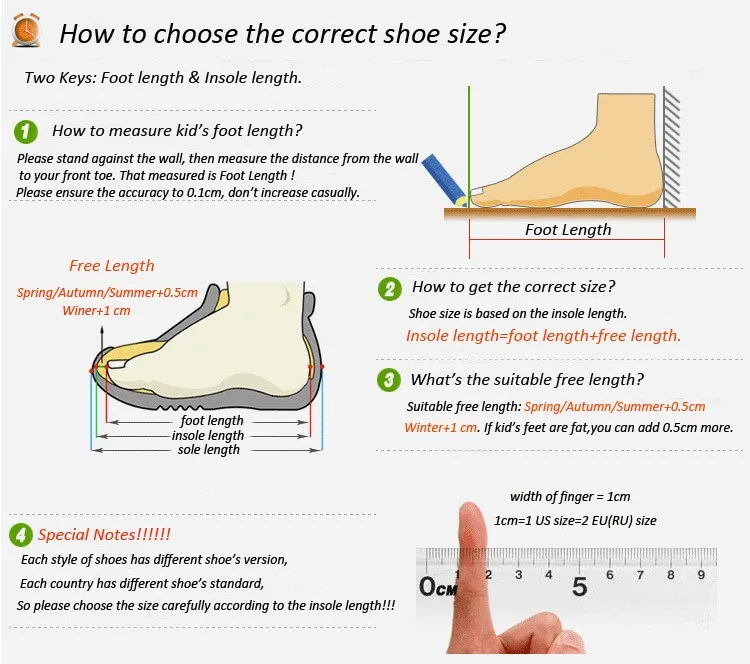 1.Before you buy shoes,please measure your children’s foot length and refer to our size chart,if your kids’ foot are fat,we advice you to choose one bigger size.If you are not sure what size to order,you can contact us any time.And there maybe 0-3cm error due to the measure by hand.!!!!