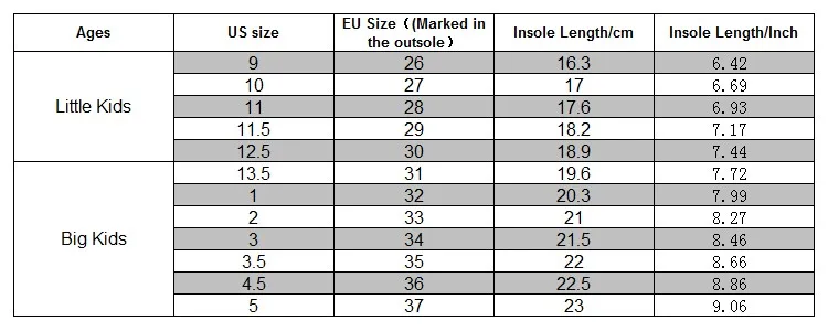 How to Choose Correct Size 1.Measure the foot length of your child. 2.Insole Length = Foot Length + (0.5-1CM). 3.Choose the US Size matched in the size chart above. 4.If you still dont know how to choose size, please contact with us.