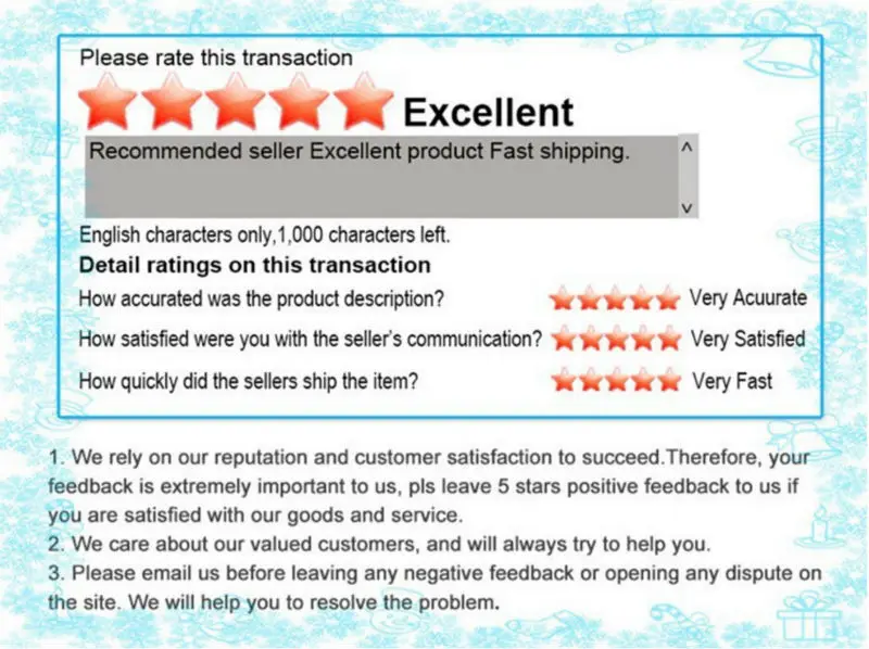 Shipping: 1.WORLDWIDE SHIPPING.(Except some countries and APO/FPO). 2.Orders processed timely after the payment verification. 3.We only ship to confirmed order addresses.Your order address MUST MATCH your shipping address. Warranty and Guarantee: 1.12months Warranty.Buy with confidence! 2.If you are not satisfied when you rece your item,please return it within 14 days for a replacement or money back.If item is defective after 3 months,you can still send it back to us.We will send you a new one after receiving the defective item.But all of these you have to pay the extra shipping fee.Please contact me before you retum it. Feedback policy: We will provide positive feedback once payment is received, To foster a healthy Ali community, we hope you will do the same for us.We want you to understand that we value customer service tremendously. If you have any dissatisfaction, please give us the opportunity to resolve the problem before leave us a negative feedback. We are sure that there is always solution and we sure don`t want a bad feedback to be where the transaction ends.