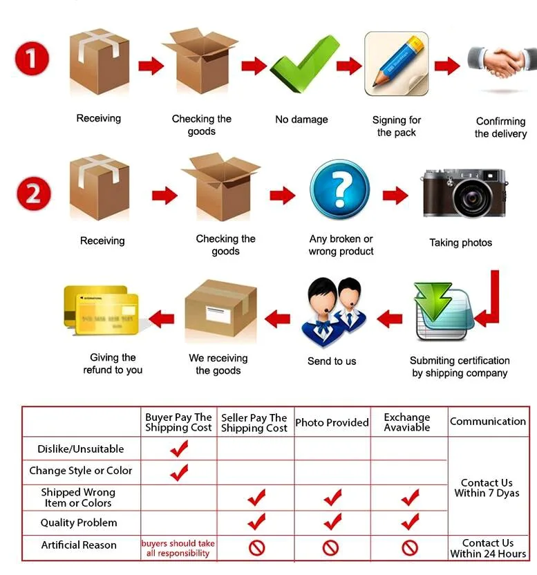 1.If products are not same as desription or broken in the transit.We will resend or refund the money to you. 2.For any reason,you are not satisfied with the items,we accept returns and exchanged within 7 days after you received your item and you need to pay for the return shipping cost. 3.You can contact us by Trademanger or leaving us an message on aliexpress or email us,3053107517 qq.com