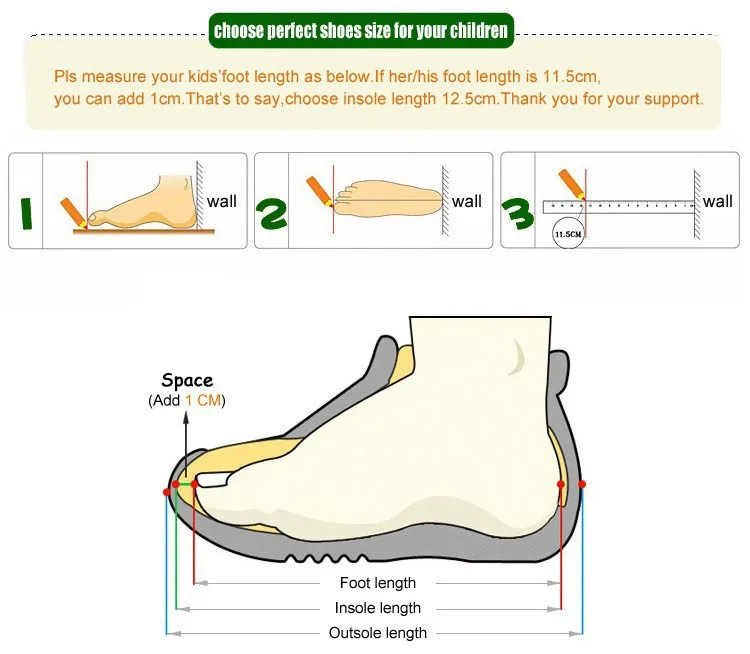 If your kids feet are fat, or you want to take extra space for growth, you can add 0.5 cm more.