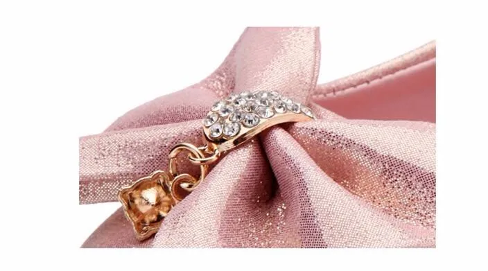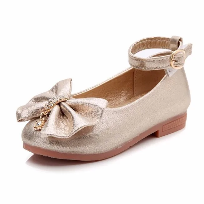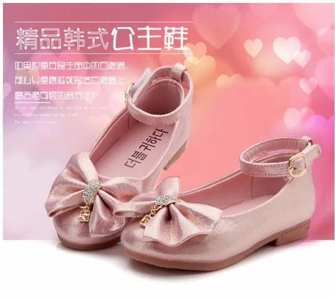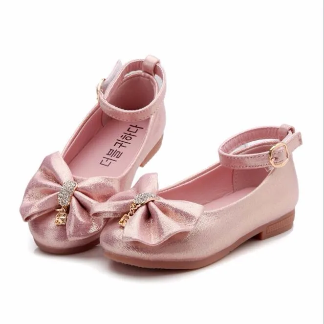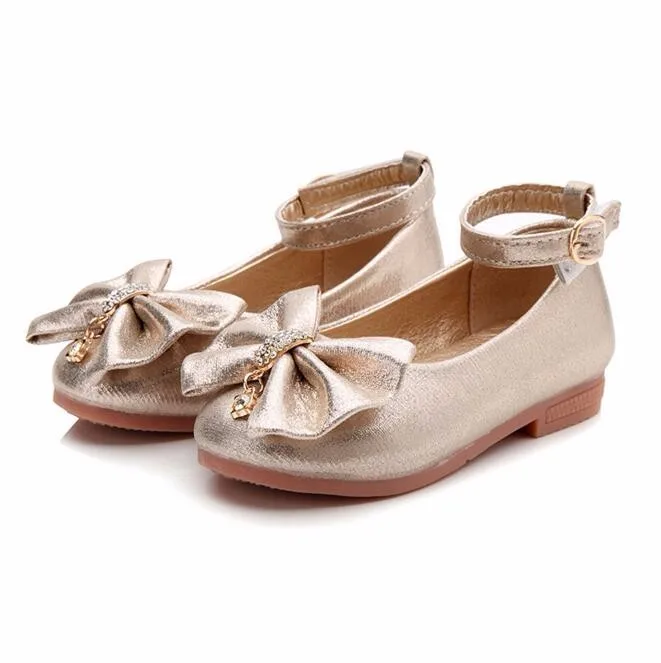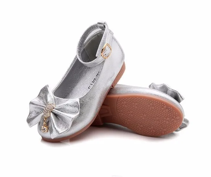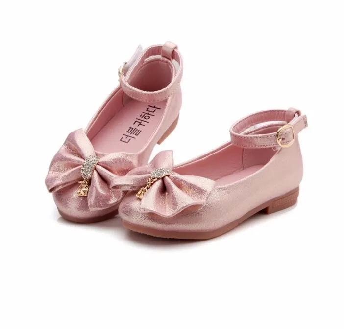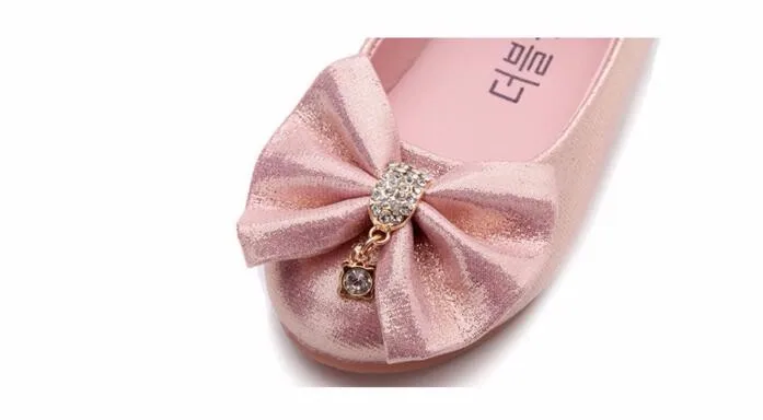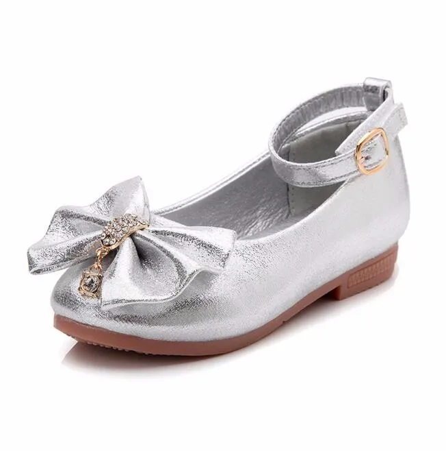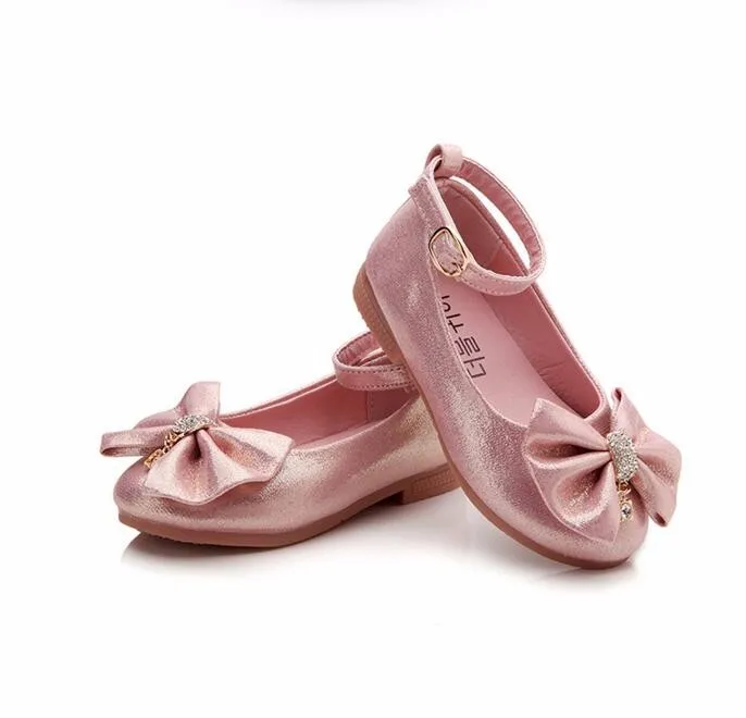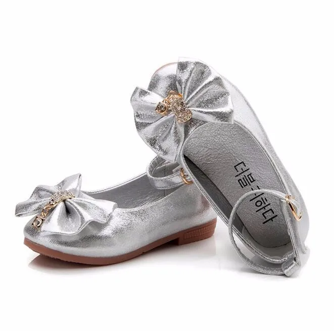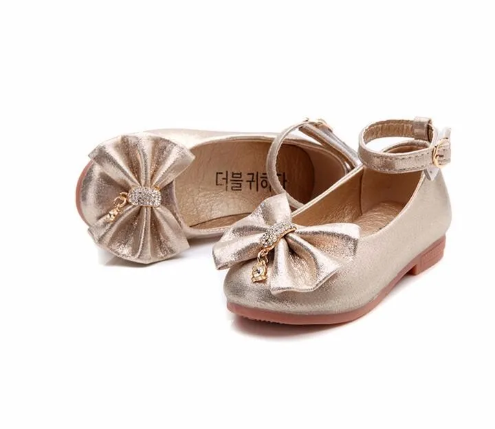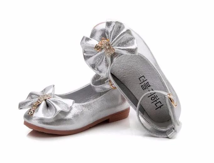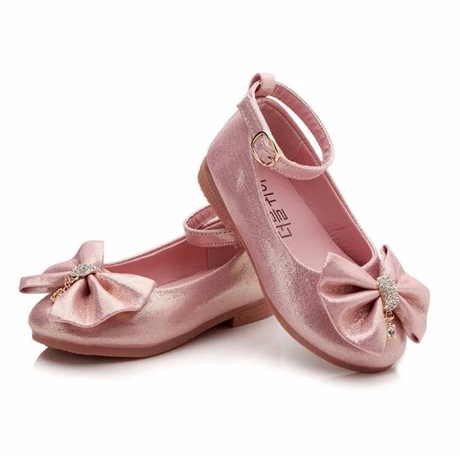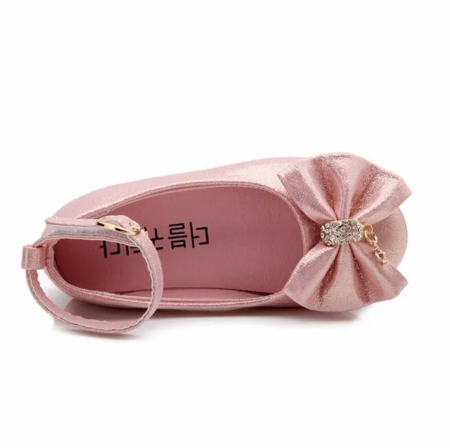 Children Princess Shoes Pink /Gold/Silvers Band Soft Sole PU Leather Fashion Bowknot Rhinestone Flower Girls Dress Shoes