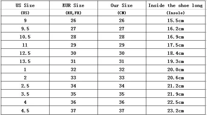 Dear friends, When you order the children’s shoes, you should according to the Insole length.(Insole length=Foot length +1cm) The US size is Not Standard ,Just convenient for you to do order. The comfortable length is the foot length add about 1cm. And Because of the long time delivery time by China Post Air Mail and child will grow up fast please choose more bigger size shoes for your child. Please choose the right size.