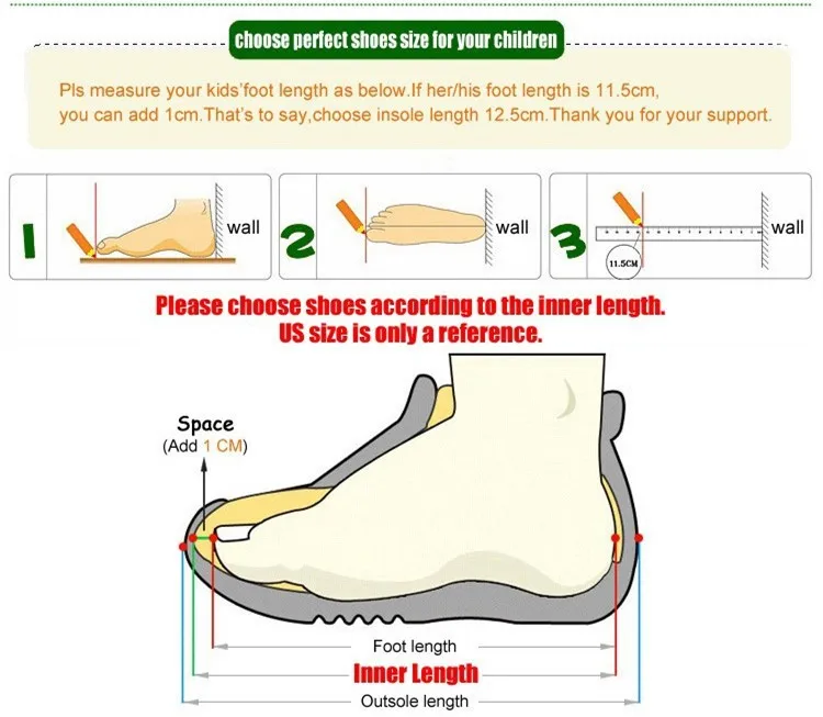 1. Maybe our shoes size can not meet the standard of your country, so please must measure your foot length carefully and choose correct shoe size;