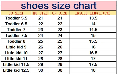 Notes: 1.Please strictly follow the size chart to select the size. Don’t select directly according to your habits. Please allow insole length 0.5 cm error due to manual measurement . 2.Insole length = kid’s foot length + 0.5 cm. You also can +1 cm if baby feet are fat. You’d better measure baby foot length by ruler. 3.The size number marked in the shoes’ sole is China size, not EU size !!! The length number which you see marked in the shoes outsole is useless, not insole length which we write in the size chart !!!! 4. Most shoes will be perfectly delivered to your hand 🙂 .We have tried our best to reject some shoes of visiable gule.But A little little Gule mark of partial shoes is happened inevitably during the factory production. If you cannot even accept any little little gule,we’re sorry that you may can try other stores. 5. If ordered the wrong sizes by yourself or just not like the shoes, you can return the shoes to us. We can refund you the money except the shipping charge from China to your destination (which we have paid the China post or other express) . 6. All shoes will be shipped with bubble bags,no boxes !!!