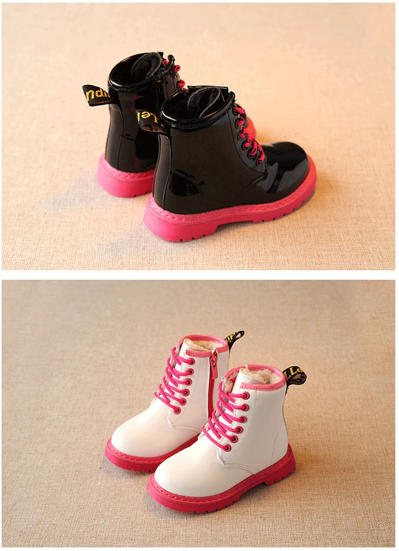 Hot Winter Children Snow Boots Fashion Kids Girls Boys Lace up Martin Boots Plush Keep Warm Antislip Patent Leather Boots Shoes
