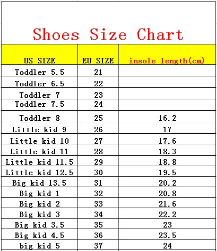 Dear friends: Because all children shoes size is difference,When you order the children’s shoes,you should according to Our size and internal length. According to the Insole length.(Insole length=Foot length +1cm) The US size is Not Standard ,Just convenient for you to do order. The comfortable length is the foot length add about 1cm. And Because of the long time delivery time by China Post Air Mail and child will grow up fast please choose more bigger size shoes for your child. Please choose the right size. All shoes will be shipped with bubble bags,no boxes !!!