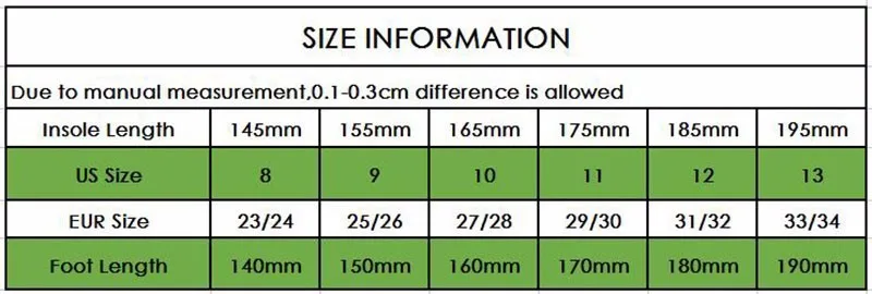 2.Measurements are the maximum size,please allow appr ±0.5-1cm tolerance. Compare the chart size with your feet length carefully before ordering.