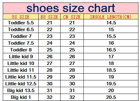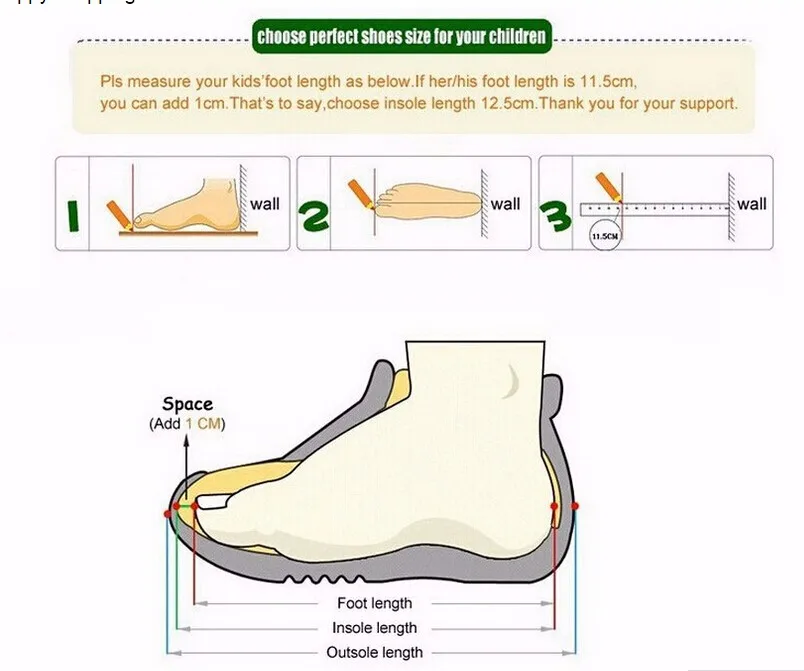 Notes: 1.Please strictly follow the size chart to select the size. Don’t select directly according to your habits. Please allow insole length 0.5 cm error due to manual measurement . 2.Insole length = kid’s foot length + 0.5 cm. You also can +1 cm if baby feet are fat. You’d better measure baby foot length by ruler. 3.The size number marked in the shoes’ sole is China size, not EU size !!! The length number which you see marked in the shoes outsole is useless, not insole length which we write in the size chart !!!! 4. Most shoes will be perfectly delivered to your hand 🙂 .We have tried our best to reject some shoes of visiable gule.But A little little Gule mark of partial shoes is happened inevitably during the factory production. If you cannot even accept any little little gule,we’re sorry that you may can try other stores. 5. If ordered the wrong sizes by yourself or just not like the shoes, you can return the shoes to us. We can refund you the money except the shipping charge from China to your destination (which we have paid the China post or other express) . 6. All shoes will be shipped with bubble bags,no boxes !!!
