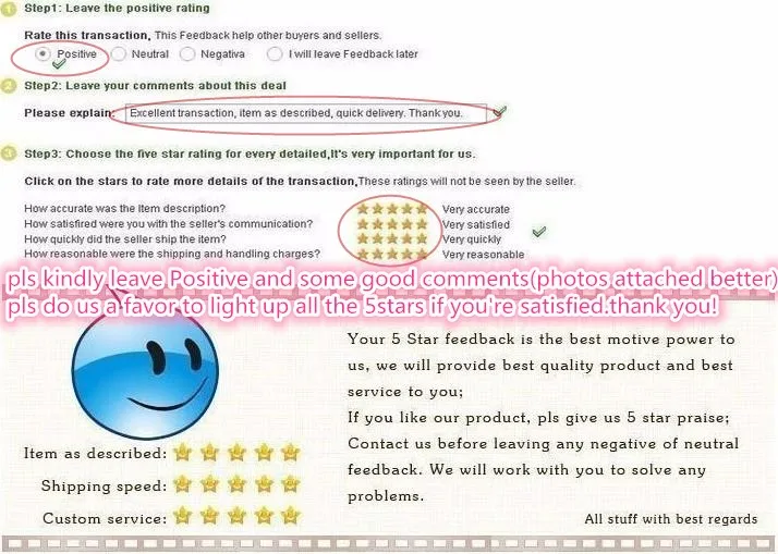 if temporarily offline,will reply in 12hours. (2)Platform Customer Service Center: Powerful comprehensive self-assist search and 24hour intelligent robbot. http://www.aliexpress.com/help/home.html (3)Alipay Customer Service Center: Helpful site specially for all payment or refund problems. https://icshall.alipay.com/hall/index.htm?sourceId=AEOnlineService&language=en_US 7.Return Policy: (1)Seller main faults: If these cases happen,we refund partial or full money with no reason. ·1.Product damaged(unable to use normally any more); ·2.Product not as described in the link; ·3.Accessory missing; ·4.Wrong parcel; Pls kindly take photos as proof and reject the parcel(if not sent by China Post Ordinary Small Packet Plus).Then,pls send me the proofs and tell the cases. I will help lead you the refund process at once. (2)Buyer main faults: We only refund partially without freight and other costs for the first 2cases. ·1.Buy wrong items carelessly ; ·2.Not as imagined and dislike it ; ·3.Giving a wrong address,thus parcel returned ; Pls kindly reject the parcel or return the goods (you need to pay the freight to local post office).Pls send me the tracking code of the parcel. I will help lead you to the refund process when I get the returned parcel. And the items must be safe and sound without affecting re-sale or use. (3)Other main faults: If the parcel is missing or held up because of logistics factors,Custom controls,natural or social force majeure(say disasters&wars&strikes). Pls contact me and I will compensate as the case may be.thank you. 8.Dispute&Feedback: ·1Everything is OK to discuss.Contact me if you have any dissatisfactions. Pls don’t open disputes and leave bad or neutral feedbacks(1-3stars) before contacting me and listening to my solutions ; ·2We admire and appreciate earnest,impartial and kind comments from you. And you can send me the screenshot when you make a good feedback. You’re able to get extra discounts or gifts for the kindness . ·3Vicious or brutal purchasing will be declined in the future and reported to the platform.Pls cherish credit and reputation.thank you.