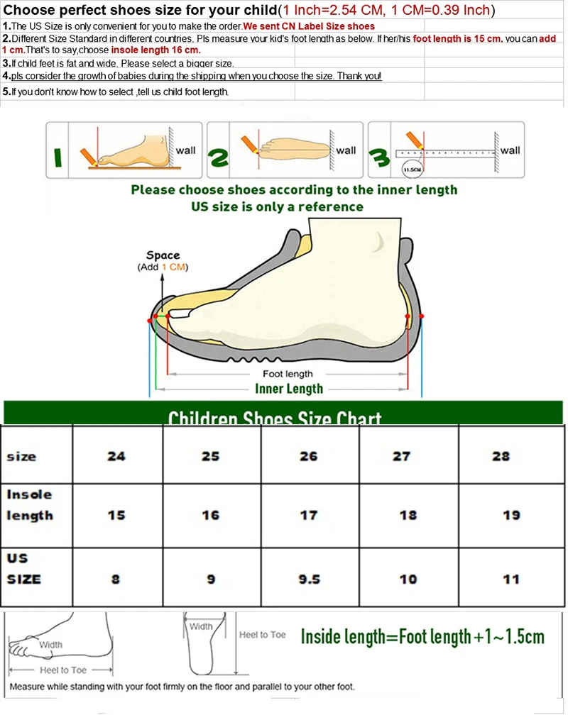 Child size reference table: US Size EUR Size Inner Length(cm) 6.5 22 13.5 cm 7 23 14.0 cm 7.5 24 14.7 cm 8 25 15.2 cm 9 26 15.8 cm 10 27 16.4 cm Note :please allow 0.3cm error due … Read More