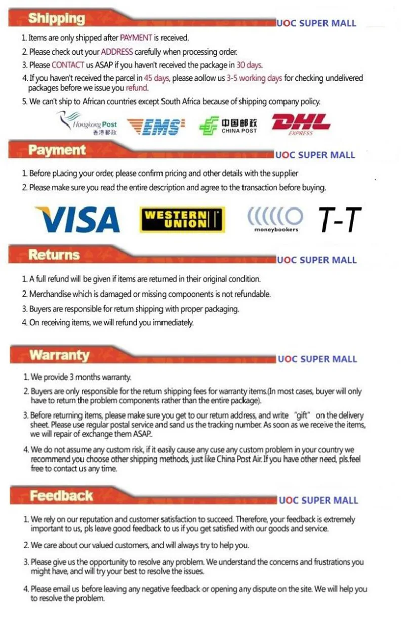 Shipment 1) Shipping will be arranged within 1-7 days after payment. If your order amount <=US $5, we use the China Post Ordinary Small Packet Plus to delivery, and it only can be tracked in China, so don’t worry … Read More