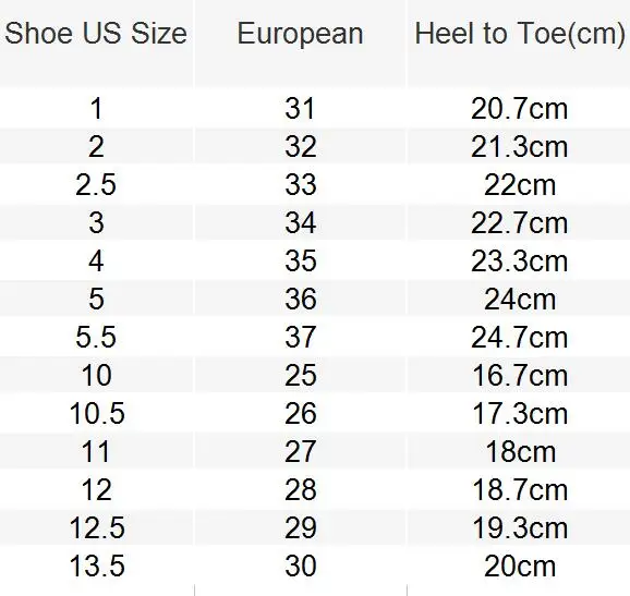 Child size reference table: US Size EUR Size Inner Length(cm) 6.5 22 13.5 cm 7 23 14.0 cm 7.5 24 14.7 cm 8 25 15.2 cm 9 26 15.8 cm 10 27 16.4 cm Note :please allow 0.3cm error due … Read More