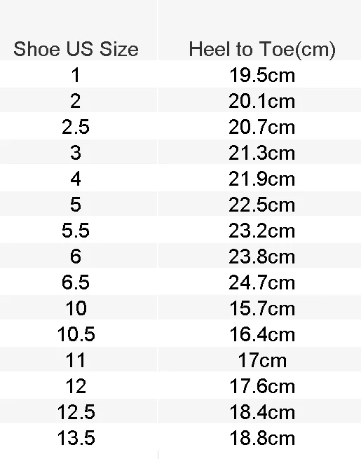 Child size reference table: US Size EUR Size Inner Length(cm) 6.5 22 13.5 cm 7 23 14.0 cm 7.5 24 14.7 cm 8 25 15.2 cm 9 26 15.8 cm 10 27 16.4 cm Note :please allow 0.3cm error due … Read More