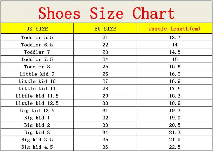 Feature: Color:Beige,Brown,Red,Pink,Purple Size:21~35 Insole Length:13.7~22.5 cm Dear friends: Because all children shoes size is difference,When you order the children’s shoes,you should according to Our size and internal length. According to the Insole length.(Insole length=Foot length +1cm) The US size is Not Standard ,Just convenient for you to do order. The comfortable length is the foot length add about 1cm. And Because of the long time delivery time by China Post Air Mail and child will grow up fast please choose more bigger size shoes for your child. Please choose the right size. All shoes will be shipped with bubble bags,no boxes !!!