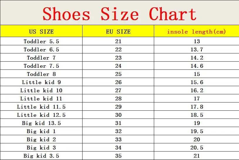Because all children shoes size is difference,When you order the children’s shoes,you should according to Our size and internal length. According to the Insole length.(Insole length=Foot length +1cm) The US size is Not Standard ,Just convenient for you to do order. The comfortable length is the foot length add about 1cm. And Because of the long time delivery time by China Post Air Mail and child will grow up fast please choose more bigger size shoes for your child. Please choose the right size. All shoes will be shipped with bubble bags,no boxes !!!