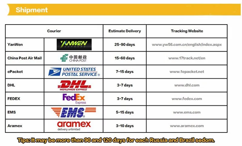 All will be shipped by international standard airmail,Sometimes may delay one more week,