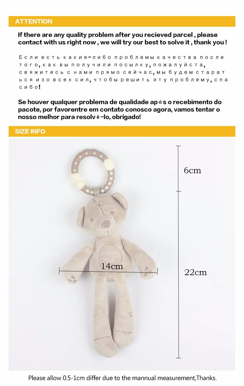Material: Plush Size: 20*18.5cm Color: Elephant, Owl, Puppy, Fox, Monkey, Lion, Zebra Age: 0-3 year-old Feature: Rattle, Pacify, Massage, Teether Package: opp bag (no retail box)