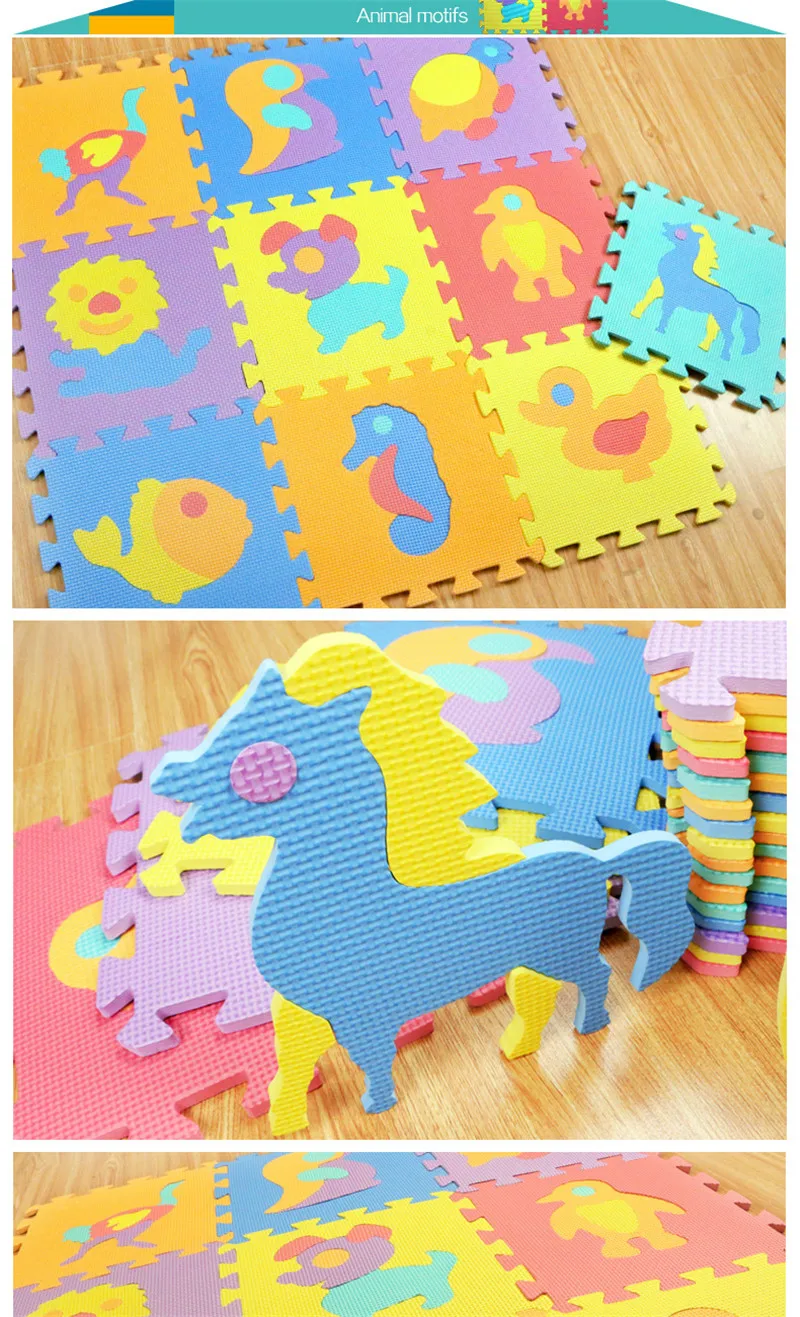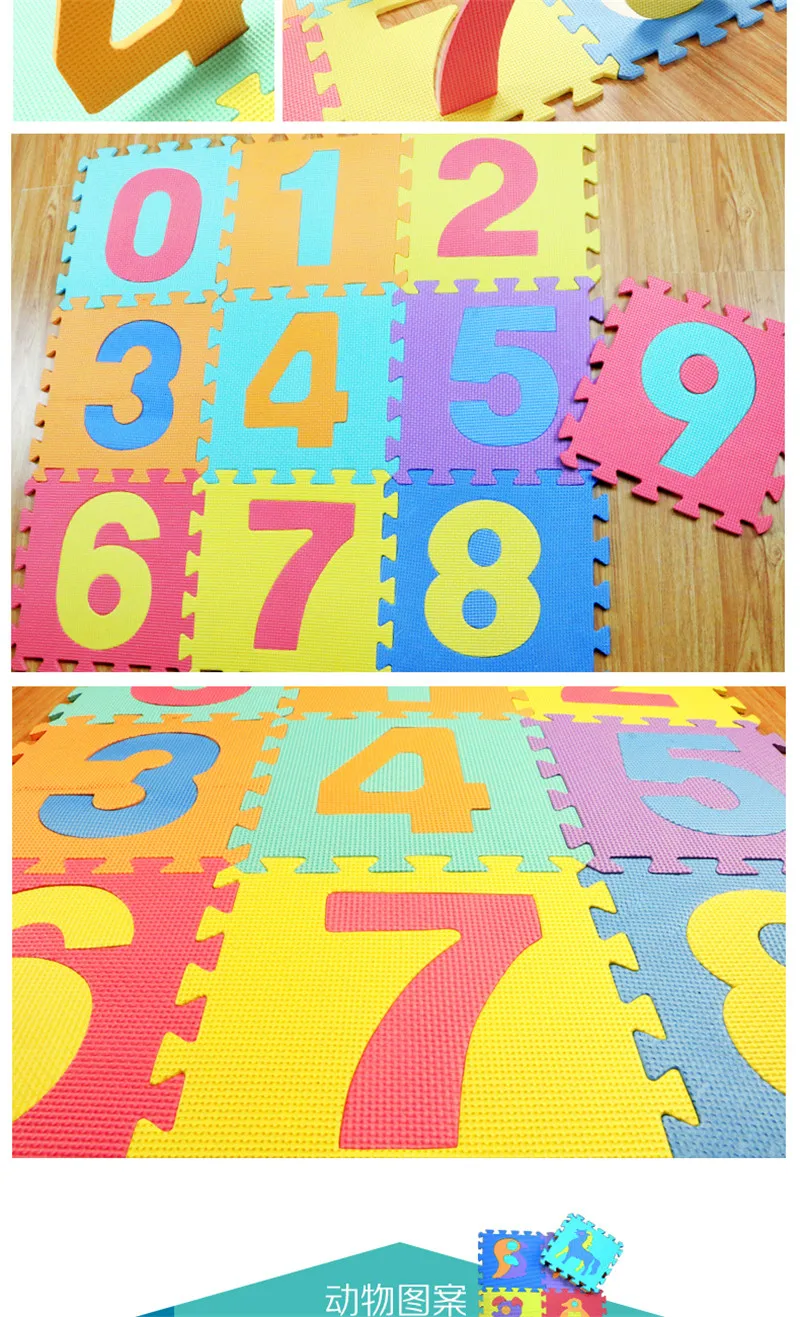 Gender: Unisex Material: EVA Features: Soft,No Music,Educational,Sports Age Range:> 3 years old,13-24 Months,0-12 Months Type: Split Joint Warning: Keep out Fire Size: 29Cm*29cm*0.9cm (1pcs) Thickness: 0.9cm Function:tapete de atividades para baby puzzle mat Suit for:juguetes bebes baby play mat,sudoku puzzle Characteristic:children’s mat Type: kids play mat,baby play mat,jigsaw puzzle mats Quantity: 10pcs (Random Color) Random Color