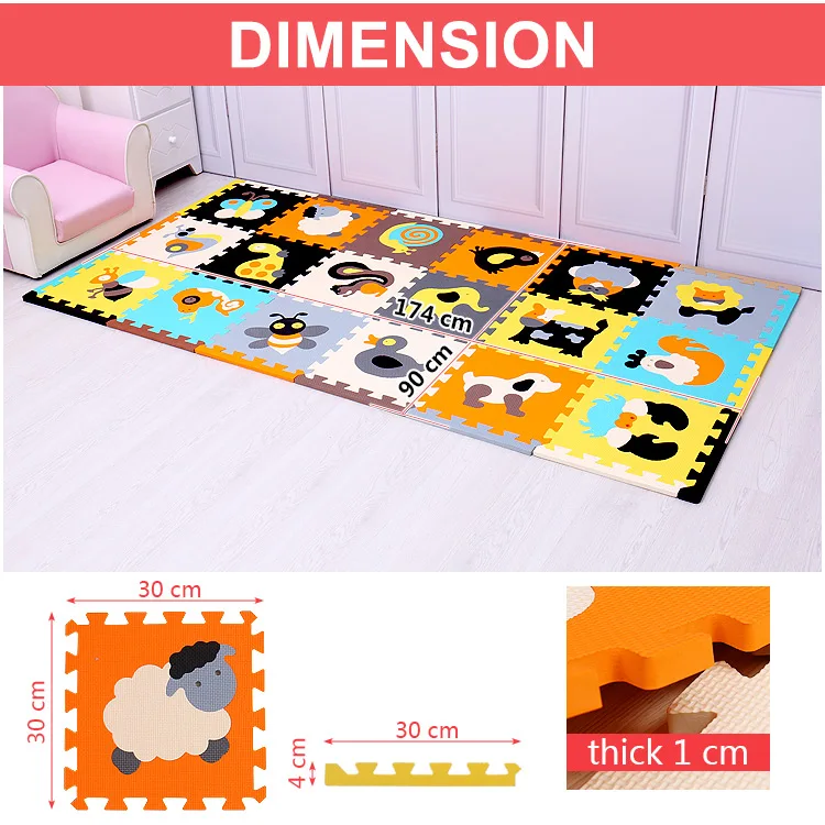 Each size:30*30*1.0cm(please allow 0.1-1cm differs.) Package:18Pcs* cushion 18Pcs* long edges Made of environmental,non-toxic and odor less EVA. Note: Because of different lots produced by factory, the color of mats may be different from the pictures,if you care about it,pls don’t buy them,we refuse the dispute about color.
