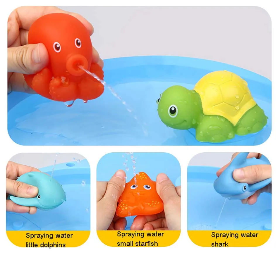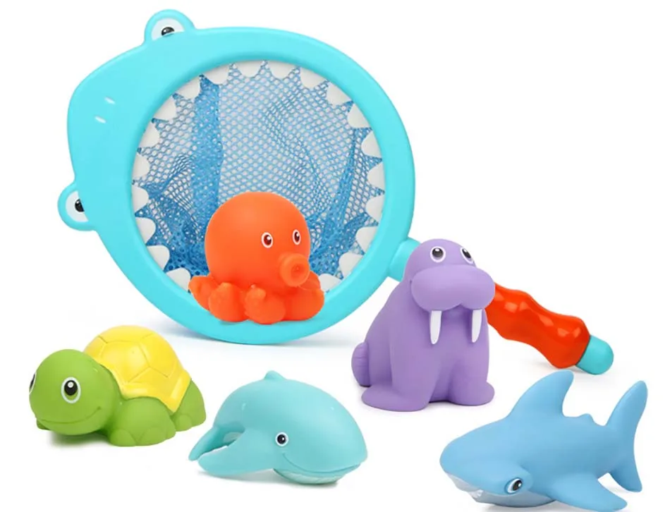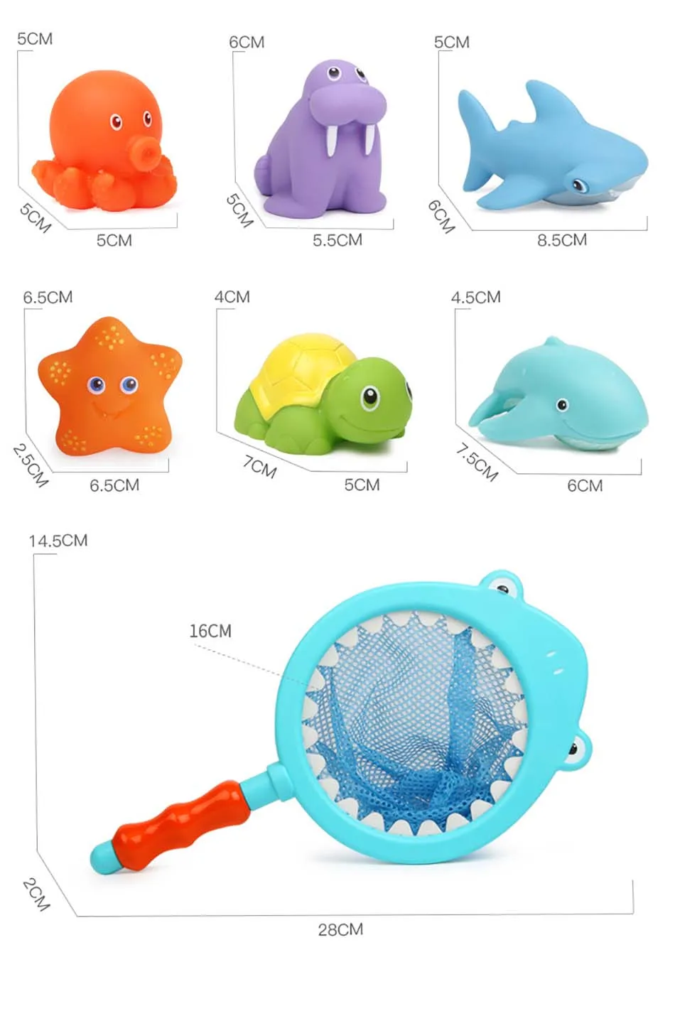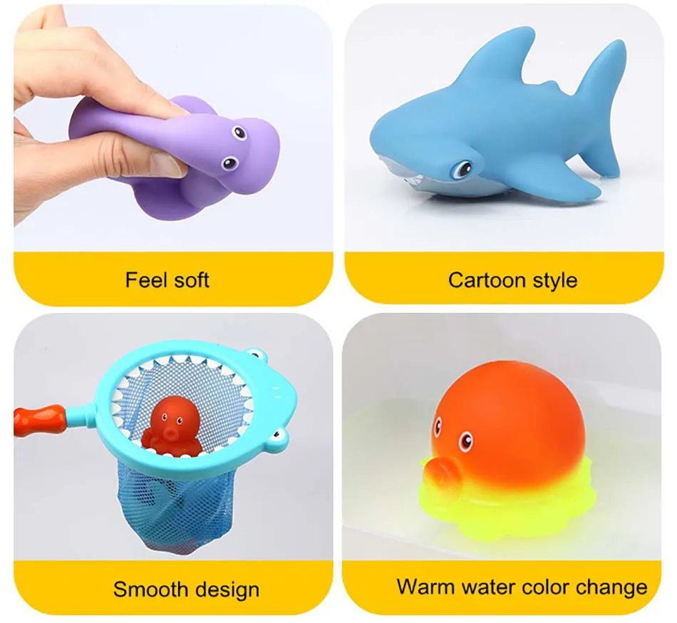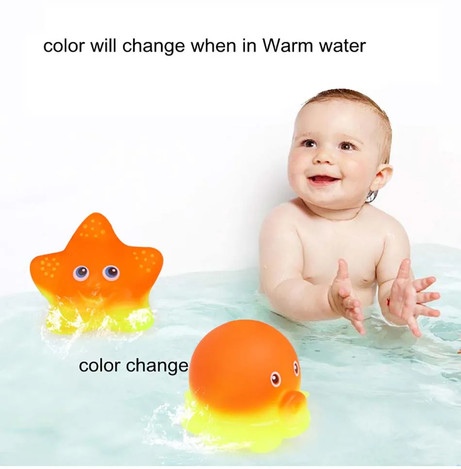 High quality. Material: Safety and environmental protection materials Type:Bath toy. Package includes: 1pcs Shark nets 1pc octopus 1pc starfish 1pc Sea lions 1pc tortoise 1pc dolphin 1pc shark Starfish and octopus can change color in warm water Attention: 1. There might be slightly difference in color, because of the computer monitor settings. 2. With the difference in the measurement method, please allow 1-2cm in size deviation (1cm=0.39 inch).Thank you for understanding!!