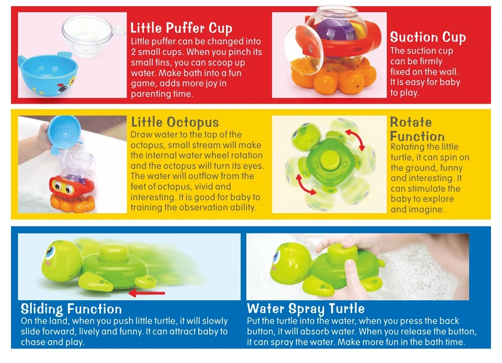 Environmental ABS materials. Safe and non-toxic toys,without hurting baby’s skin. Baby Bath Toy Encourages Independent Play And Exploration During Bath Time Great for babies and toddlers Specification: Materail:ABS Plastic Product size:11*9*8cm/10*10*8.5cm/12.5*15.5*6.5cm Weight:about 0.55kg Time to Market: April 2017 Package included: 1PC* Baby Water Spray Turtle Bath Toy