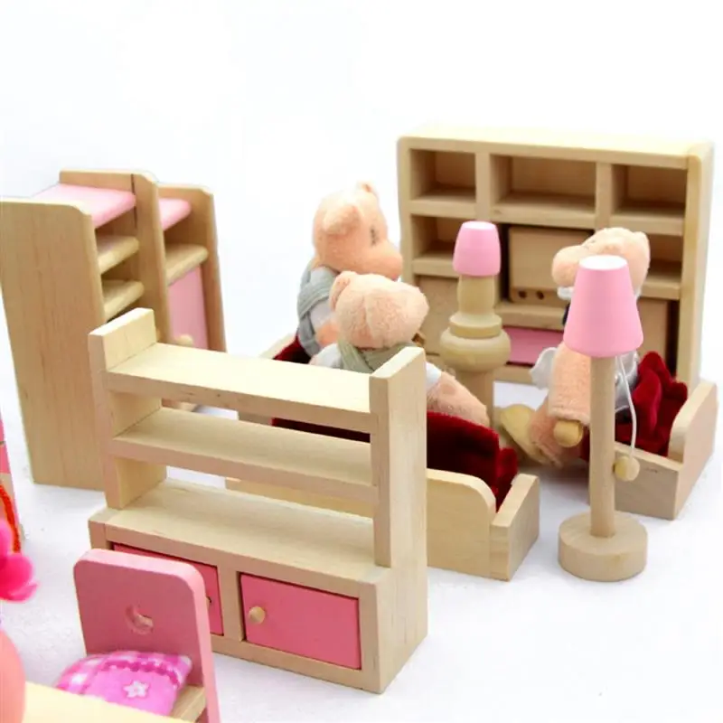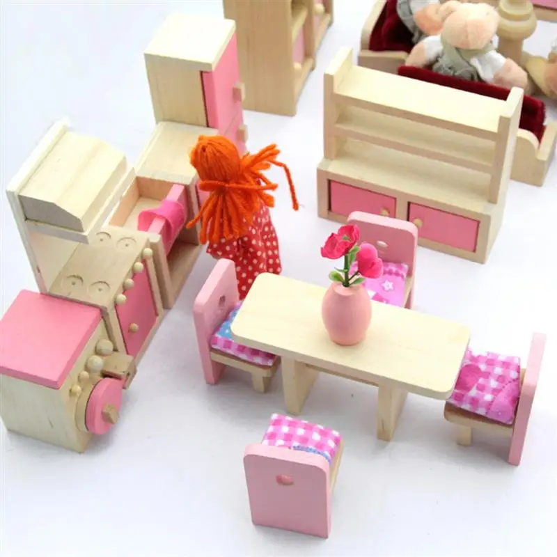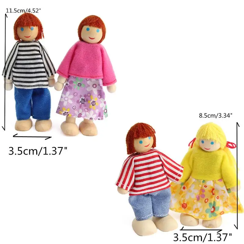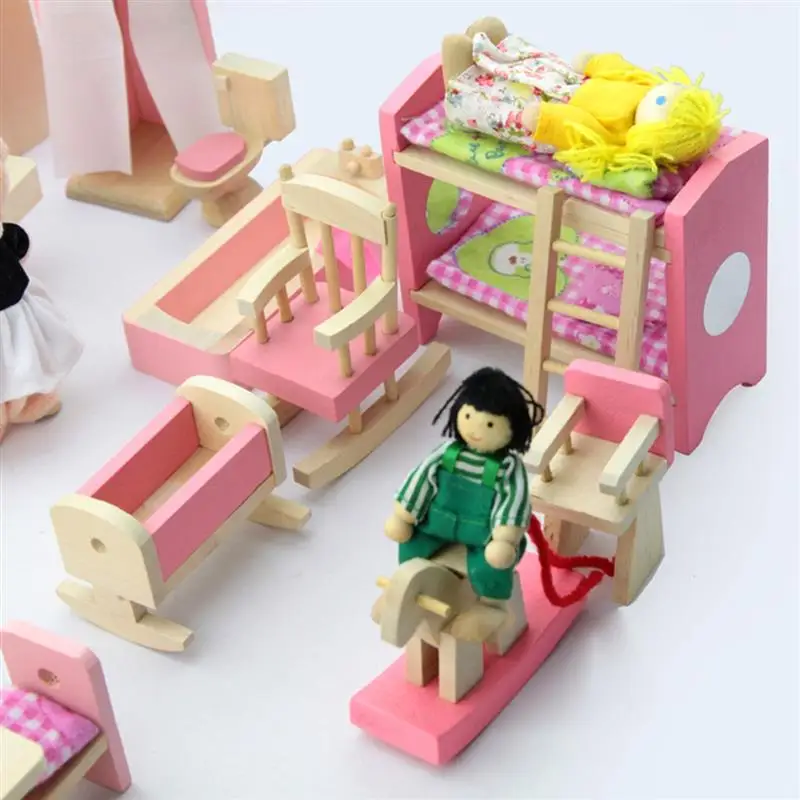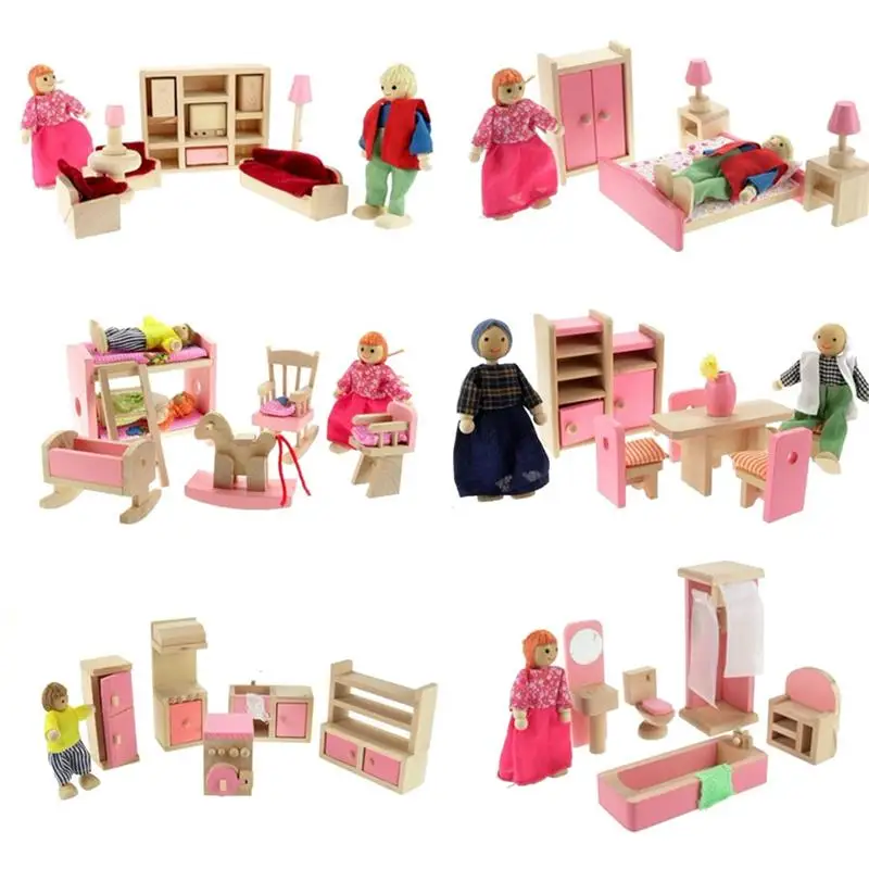 Wooden Delicate Dollhouse Furniture Toys Miniature For Kids Children Pretend Play 6 Room set/4 Dolls Toys