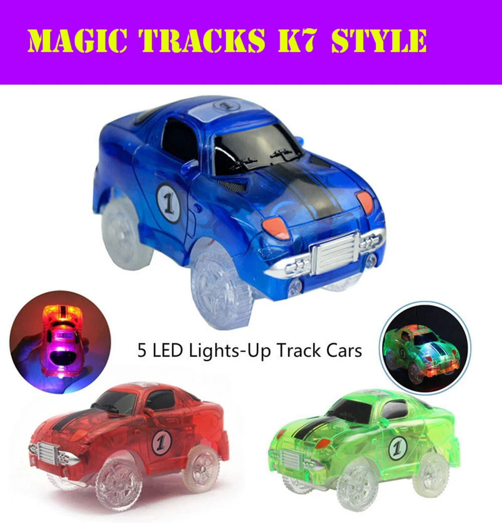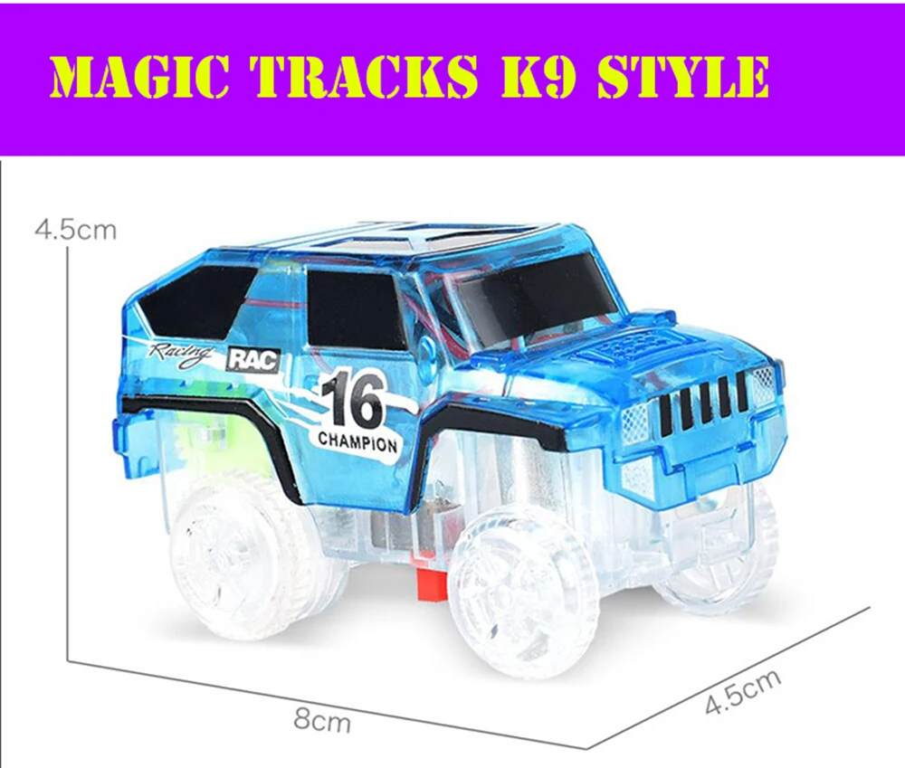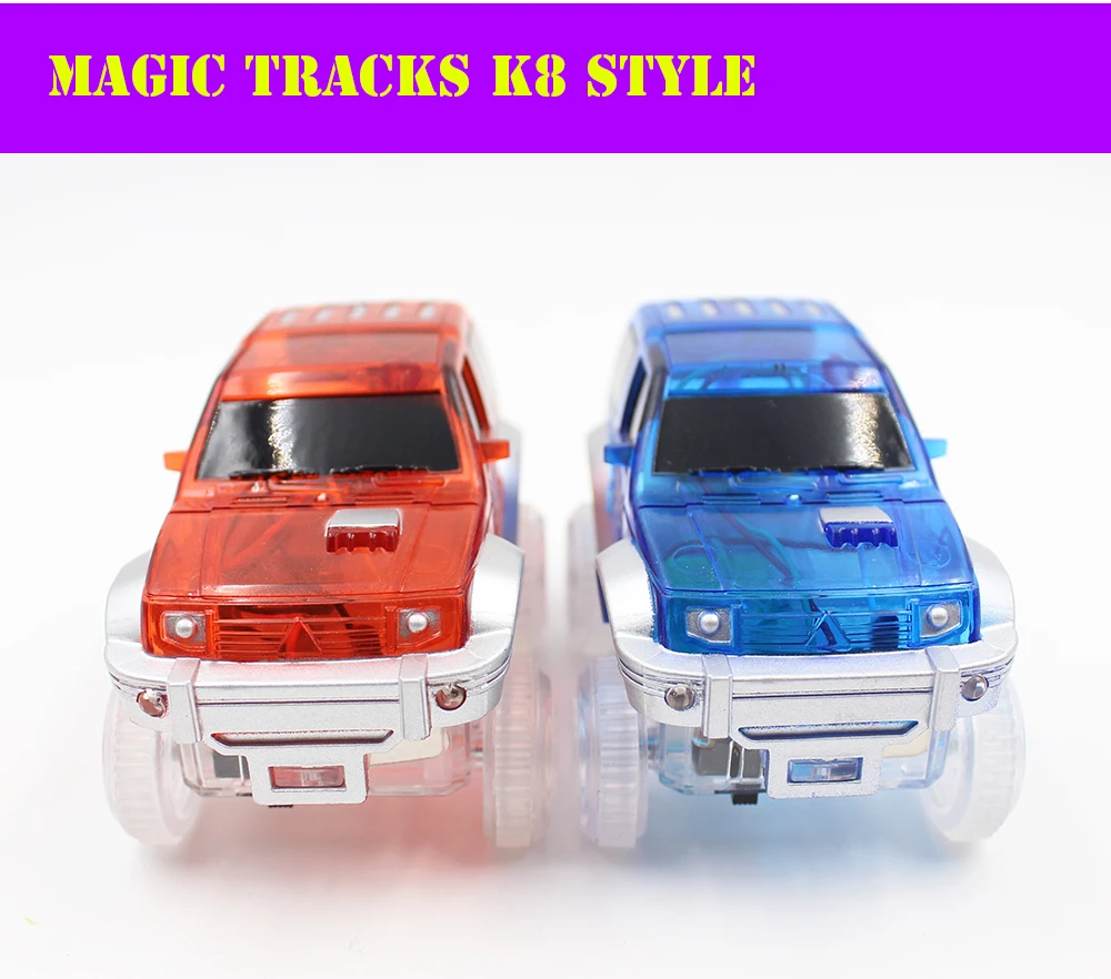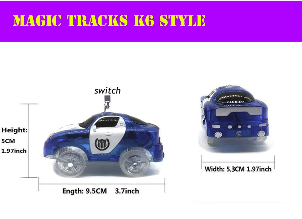 8 Styles Electronics Magic Track Cars Led Flashing for Glow in the dark Tracks Toys For Kids K1 K2 K3 K9 Cars’ width 4.00-4.25 cm. K4 K6 K7 K8 Cars’ width 5.25-5.35 cm. 8 Styles Led Flashing Electronics Cars ALL Play On Track Best Car Gift For Kids Package:1pcs Car As Picture you choose With APP Bags Material: ABS Plastic Weight: Around 70g. Power: 1 – 2 AA battery ( Not Include ) or 1-3 AAA battery ( Not Include ) Ages 3+